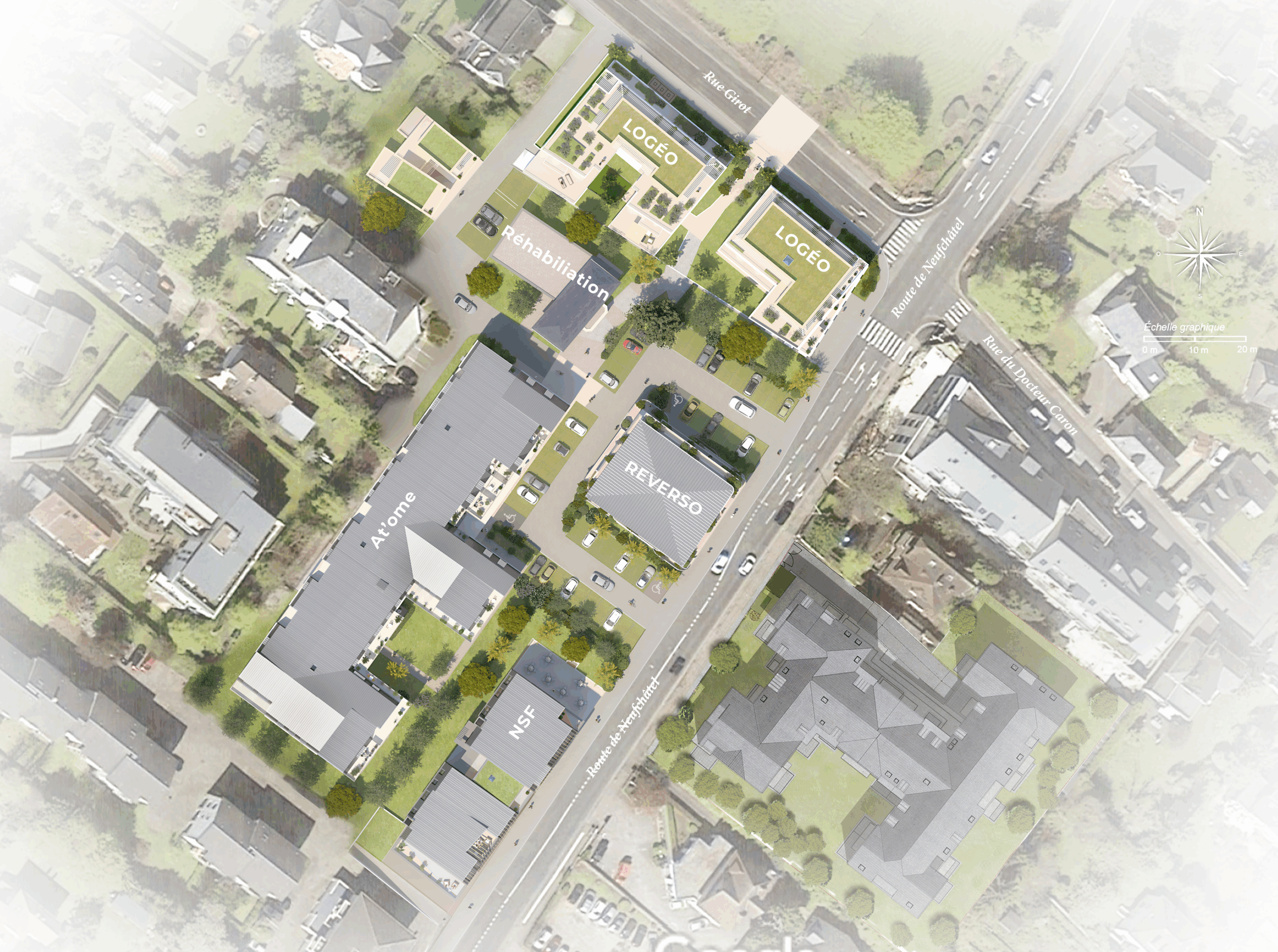 Notre projet s’inscrit dans un programme plus vaste de requalification d’un ensemble résidentiel et commercial, au carrefour des communes de Bois-Guillaume, Rouen et Bihorel. C’est l’occasion rêvée de créer un pôle attractif fort sur un des axes principaux de la métropole. Le plan général s’organise autour d’une placette centrale en forme de U, composée d’espaces verts et de stationnements desservant les locaux commerciaux. Les bâtiments se composent de trois strates superposées : les stationnements en sous-sol pour les logements, à rez-de-chaussée les commerces et les accès des halls, et les trois niveaux de logements en étages. Au-dessus des vitrines des commerces, formant un socle trans- parent et léger, nous avons opté́ pour un traitement architectural différencié suivant les bâtiments, pour ne pas faire masse, mais en harmonisant les vocabulaires utilisés : alternances de strates horizontales blanches des balcons et loggias, séquences verticales en briques de terre cuite et en zinc, toitures zinc en combles.