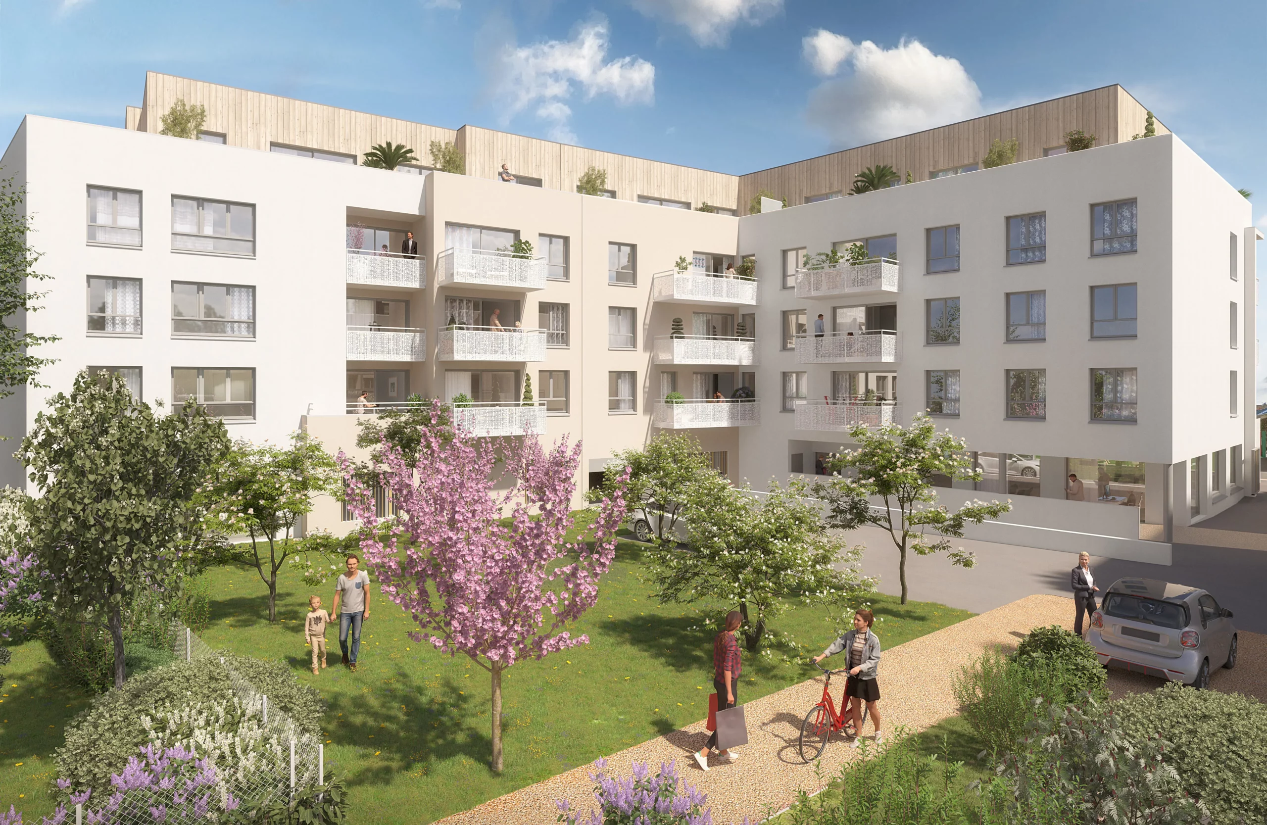 Espaces extérieurs confortables et respectant l’intimité de chacun, verger partagé en cœur d’îlot, façades élégantes et contemporaines, vues dégagées, la résidence s’intègre dans un environnement calme et résidentiel.